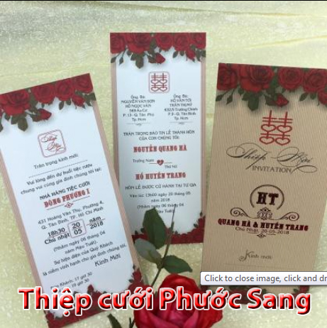 - Hoa văn thiệp nhẹ nhàng, thẩm mỹ, tinh tế, đẹp sắc sảo.Thiệp cưới Phước Sang, được thành lập vào năm 2008. Đến nay đã xây dựng hình ảnh uy tín với khách hàng, đối tác trong lĩnh vực In Thiệp Cưới cũng như in biểu mẫu, in lụa, in offset, in danh thiếp,... Là địa chỉ in thiệp cưới đáng tin cậy tại TP.HCM.